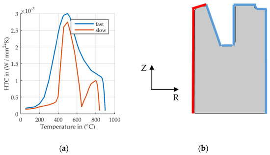 Mechanical boundary conditions consider rotational symmetry about the cylinder axis and mirror symmetry about the height of the gear blank. Thermal boundary conditions depend on the process step: During heating and furnace cooling, a constant Heat Transfer Coefficient (HTC) is applied. During quenching, two different temperature-dependent HTCs are considered, see Figure 4.