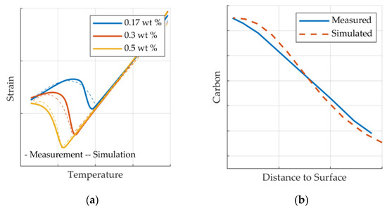 Validation of material parameters. Comparison of simulated and measured values of dilatometer and carburizing trials. (a) Dilatometry. (b) Carburizing.
