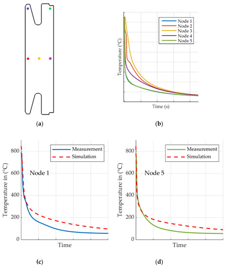 The effective temperature curves are dictated by the applied HTCs and by the thickness of the part in each region. Predicted cooling curves can be divided into separate qualitative groups by cooling rate: The fastest cooling occurs in the thinner section of the part with the highest HTC. The thin gear arms—nodes one and five—cool fast and will also most likely start to deform before the gear body starts to deform. On the outside of the massive mid-section, at node four, cooling is slower due to heat flow from the gear body. Cooling on the inner radius, node two, exhibits distinct boiling and convection phases which is related to the HTC for 0 m/s velocity, Figure 4. The massive mid-section of the gear cools faster on the outside and slower on the inside which leads to thermal stresses and subsequently to displacements and possibly to distortion. Figure 7c,d shows a comparison between measured and simulated temperatures. Two nodes in regions with different HTCs, one close to the inner diameter and one close to the outer diameter, are chosen. The initial quenching process with the steepest temperature gradients is replicated with high agreement for both nodes. Starting below 250 °C measurements and simulations start to deviate from each other and a larger error develops.