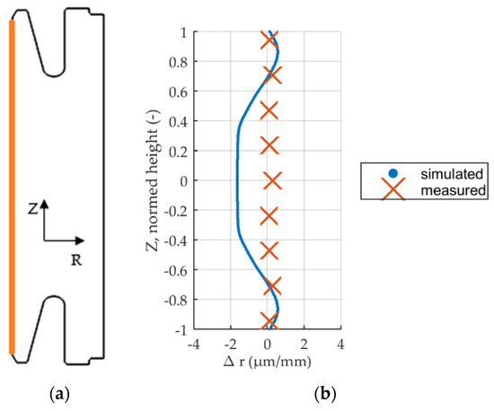 The profile comparison yields good agreement between measured and simulated relative radial displacement for top and bottom of the gear blank. The model overpredicts shrinkage in the middle section between normed height [−0.6…0.6]. The characteristic bending towards the inner bore of top and bottom due to the recesses is captured well and agrees with measurement data. For a further comparison, the percentage deviation between measured and simulated profiles is shown in Figure 9.