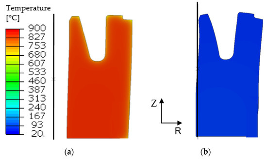 Cooling curves in Figure 7 show that the slowest cooling is present in the middle of the gear at node three. Different cooling rates lead to high thermal gradients within the part. Therefore, thermal shrinkage takes place in a nonuniform complex way. Distortion of the part is influenced by three main events: thermal shrinkage, contact with the mandrel, and phase transformations, which lead to volume and density changes. The resulting distortion is discussed in the following section; Figure 10 depicts the gear in austenitized state before quenching starts and in the quenched state, shrank, and in contact with the mandrel.