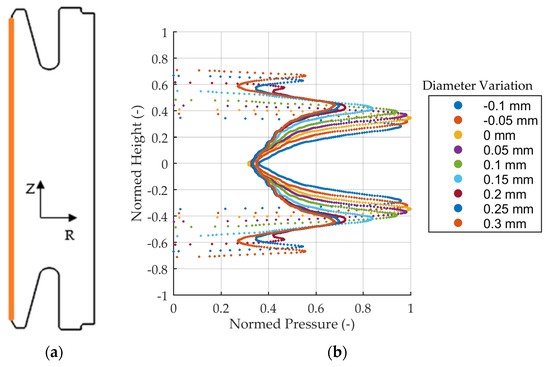 The model reveals two different types of pressure over normalized height curves depending on the mandrel diameter variation: The three largest diameters—Φ +0.2 mm, Φ +0.25 mm, and Φ +0.3 mm—show four peaks: two small ones between height ±0.5 and height ±1 and two larger peaks around the middle. All other diameters only have two pressure peaks. It can also clearly be seen that shrinkage onto the mandrel is not complete and that contact area more than doubles for a 0.3 mm larger diameter mandrel. At the middle of the gear at height zero, the nominal diameter yields the smallest pressure and the smallest diameter yields the largest pressure. In Figure 12a, peak pressure values and contact area show opposite trends. The smallest, nominal, and largest diameters are marked by a diamond. Smaller diameters result in a higher pressure and a smaller contact area. The development of peak pressure though is nonlinear. Highest peak pressure values are calculated for the nominal diameter, whereas the largest diameter yields the smallest peak pressure. Despite smaller contact area, peak pressure for the two smallest diameters, Φ −0.05 mm and Φ −0.1 mm, decreases by 5% and 2%, respectively, compared to the nominal diameter’s peak pressure. For a further analysis, pressure is integrated over height and radius and then averaged by division by the corresponding contact area, see Figure 12b. In spite of the nonlinear development of peak pressure, the average pressure decreases roughly linear with increasing mandrel diameter. Peak pressure and the average force are important for process control since the tool can only exhibit a limited press out force without damaging the gear blank.