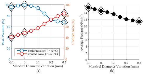 (a) Peak contact pressure and contact area between part and mandrel indicating incomplete shrinkage of the part onto the mandrel. (b) Average pressure over mandrel diameter variation.