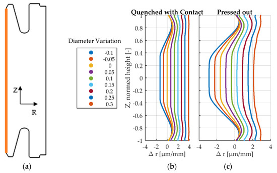 To validate the model and to assess the quality of the tested simulated variations, the simulated radial profile of the inner diameter is compared to measurement data. The radius has been measured by a coordinate measurement machine at nine evenly spaced positions along the height of the gear blank. Measurements have been carried out before and after quenching by the industry partner. Figure 8 shows the relative displacement over height in µm/mm.