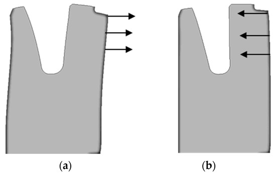 The area of the part that has been in contact shows a larger displacement after mandrel removal. With increasing contact area, the resulting shape changes become smaller, see largest diameter Φ +0.3 mm. For the smaller diameters, the contact area does not extend beyond half the nominal height. This results in high peak pressure and consequently in larger deformations due to release of elastic energy after mandrel removal, see Figure 13b, blue and red curves for diameters Φ −0.1 mm and Φ −0.05 mm. Much larger displacements are calculated for diameters Φ −0.1 mm and Φ +0.1 mm than for Φ +0.3 mm. A dimensional change is present for the largest mandrel diameter but the shape change is the smallest. Smaller contact area on the inner radius and high pressures lead to larger influence of elasticity on deformations of the gear blank. Next, the outer diameter is qualitatively examined in Figure 14.