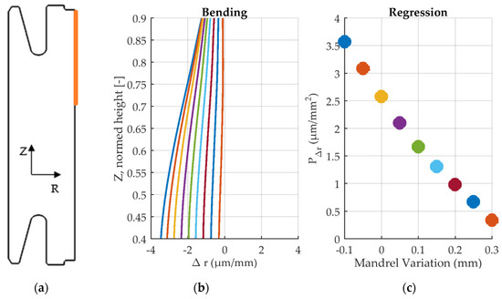 Bending of outer radius for all mandrel diameter variations in quenched state with contact between part and mandrel. (a) Evaluated area. (b) Bending between height 0.4 and 0.9. (c) Regression coefficients over mandrel diameter variation.
