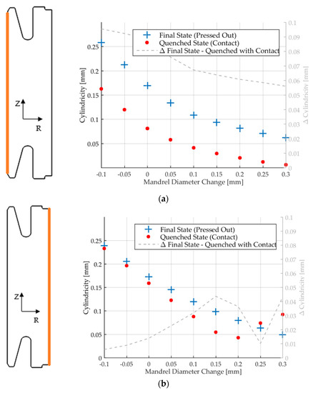 The smallest mandrel diameter results in the highest cylindricity and the largest mandrel diameter yields the lowest cylindricity, this observation is valid for inner and outer radius in the final state. The dashed curve shows the difference in cylindricity between quenching and mandrel removal. This delta value gives an indication of the amount and relevance of the release of stored elastic energy. A large difference designates a large spring back due to elasticity. A strong nonlinear development of the cylindricity difference for the outer radius can be observed. The maximum difference is present for Φ +0.15 mm. To explain the underlying mechanisms, it is important to understand the role of the mandrel radius and the height of contact on the inner radius. The contact area increases from 40% to nearly 80% with increasing mandrel radius. This seems to induce different bending moments on the outer radius. The zero-crossing of the calculated bending gradient P∆r, see Figure 12 Φ +0.2 mm, indicates the change of the bending direction. A reversal of the inward bending to an outward bending takes place for mandrel diameters larger than Φ +0.2 mm.