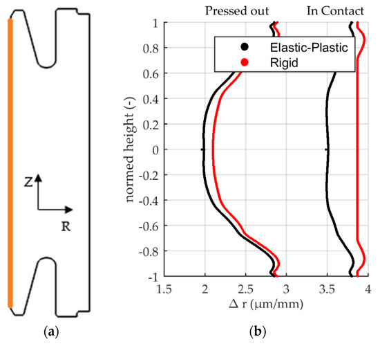 (a) Analysis location. (b) Relative displacement of the inner radius in µm/mm. Elastic-plastic vs rigid mandrel. Two process steps are shown: (1) Quenched, still in contact with the mandrel. (2) Pressed out after release of elastic energy.