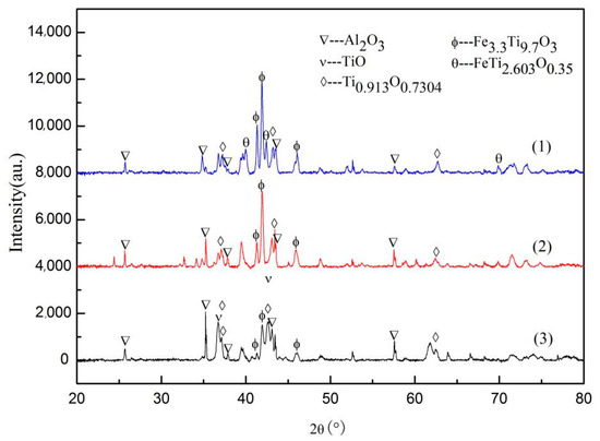 Figure 5 shows XRD patterns of alloys directly prepared by thermite method with a melt separation. The obvious diffraction peaks of Al2O3, Fe3.3Ti9.7O3, FeTi2.6O0.75 and TiO can be observed in the alloy directly prepared by thermite method. This means that the metal and slag have an incomplete separation because of the direct casting and a rapid cooling. However, the diffraction peaks of alloys after a melt separation with the addition of Al2O3-CaO-CaF2 slag can be indexed to Fe0.9536O, TiFe, Ti2O, Al3Ti0.75Fe0.25, Al86Fe14 and Al2.1Ti2.9, but diffraction peaks of Al2O3 cannot be observed. The existing state of elements in the alloy is determined by thermite reduction reaction at high temperature, diffusive migration and recombination of constituent element during melt separation [23]. The Ti, which is reduced by residual aluminum in the alloy, preferentially combines with Fe to form Ti-Fe metallic compound and Ti3.3Fe9.7O3 [24]. However, new intermetallic compounds, such as Al86Fe14, Al3Ti0.75Fe0.25, are produced after a melt separation with high basicity Al2O3-CaO-CaF2 slag. It can be supposed that the formation of Al86Fe14, Al3Ti0.75Fe0.25 is mainly due to the basicity change of slag, diffusive migration and recombination of constituent element during melt separation. As a result, melt separation has a great effect not only on regulating the microstructure of the alloys but also on the removal of Al2O3 inclusions. This result agrees well with the microstructure analysis in Figure 4e–g.