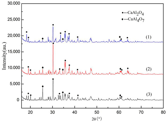XRD patterns of slags after melt separation with addition of Al2O3-CaO-CaF2 slag at 1650 °C: (1) 30 min, (2) 60 min, (3) 90 min.