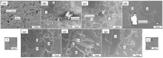 Figure 4a indicates that the microstructure of the alloy directly prepared by thermite method is loose and contains amorphous Al2O3 inclusions with a size about 200 μm, which indicates an incomplete slag-metal separation. Figure 4b–d shows that Al2O3 inclusions can also be observed in the alloys after different separation time in the cases without addition of Al2O3-CaO-CaF2 slag. However, the morphology and size of Al2O3 inclusions are different with different melt separation time. Comparing to thermite method, Al2O3 inclusions in melt separation under heat preservation go through an aggregation-floating upward-recrystallization process, which is beneficial to the Al2O3 inclusion removal. The sizes of Al2O3 inclusion in the alloy are uneven, ranging from 5–50 μm under a 30 min separation, and the size ranges from 10 to 20 μm after a 60 min separation. However, they are rod-like with a size about 70 μm at 90 min separation. This result indicates that big size Al2O3 inclusions can float upwards and are preferentially separated out. However, small size Al2O3 inclusions get together, recrystallize and grow up with melt separation time and then are separated out. Compared to the alloys without addition of Al2O3-CaO-CaF2 slag for melt separation in Figure 4b–d, Al2O3 inclusions can hardly be observed in the alloys for the cases with addition of Al2O3-CaO-CaF2 slag in Figure 4e–g. In addition, the microstructure of alloys is more uniform and compact, which indicates that the effects of slag-metal separation are greatly enhanced.