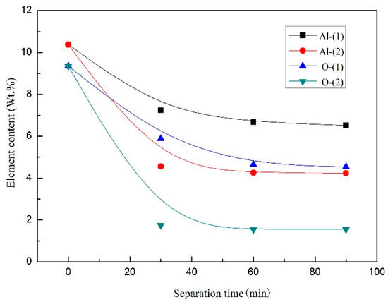 The curves of Al and O contents in alloys with the melt separation time: (1) without addition of Al2O3-CaO-CaF2 slag; (2) with addition of Al2O3-CaO-CaF2 slag.