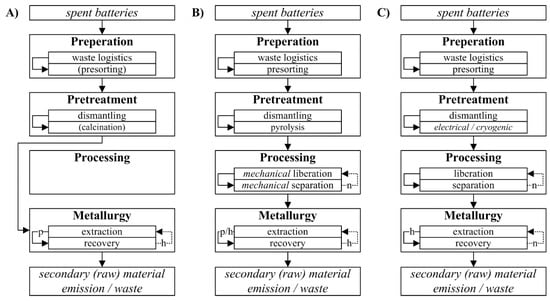 Werner, D.; Peuker, U.A.; Mütze, T. Recycling Chain for Spent Lithium-Ion Batteries. Metals 2020, 10, 316. https://doi.org/10.3390/met10030316