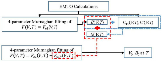 In the second step, indicated in Figure 1 using boxes with dashed boundaries, the results of the adiabatic volume-dependent bulk modulus, volume-dependent C11, C12, and C44 were used for calculating the temperature- and volume-dependent average shear modulus that appears in Equations (8) and (9) through the Voigt–Reuss–Hill averaging method [37] as follows,