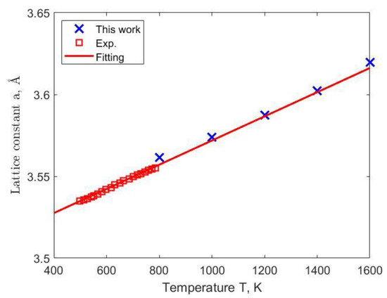 The lattice parameter and thermal expansion coefficient (TEC), calculated as a function of temperature, are shown in Figure 4 and Figure 5 where the calculated results are compared with available experimental information. It can be seen in Figure 4 that the theoretical values of the lattice parameter, as well as its temperature dependence, are similar to the experimental data. Although the theoretical values of TEC are smaller than experimental values at about 800 K, the theoretical and experimental TEC values are close to each other at temperatures above 1000 K. The temperature dependencies of the lattice parameter and TEC agree with the experimentally observed trends at high temperatures.