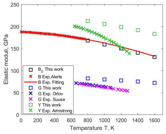 Summing together the EMTO-calculated partial free energy and the vibrational free energy given by the quasi-harmonic Debye model, one obtains the total Helmholtz free energy, Equation (1), from which the equilibrium volume and isothermal bulk modulus can be determined as specified at the end of Section 2.3 (the third step). At the equilibrium volume, the shear elastic constants C’ and C44 can be evaluated (either by interpolating the previously calculated values or by making additional EMTO calculations at the equilibrium volume and temperature T). Thus, one obtains the set of temperature-dependent single-crystal elastic constants C11, C12, and C44, from which the isothermal shear modulus G0 of paramagnetic nickel can be determined as the Hill average. With these results at hand, the polycrystalline Young’s modulus Y can be calculated as follows:
