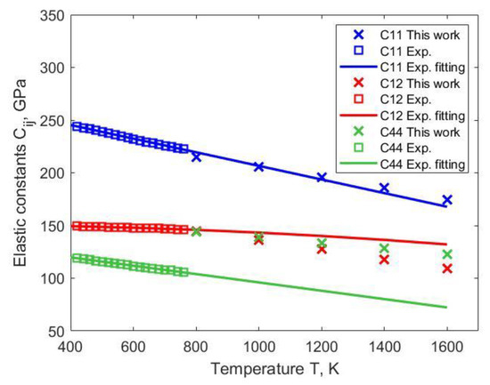 Temperature-dependent elastic properties, such as the shear modulus and lattice constant, are important parameters in modeling the high-temperature strength (in particular, creep strength) of alloys; for example, for evaluating solid solution strengthening (SSS) [4,5,6,7]. Despite the importance of such parameters, few experimental data can be found. During the past decades, the first-principles method based on density functional theory (DFT) was widely used to investigate the elastic properties of metal alloys [7,8,9,10]. Although the elastic moduli of nickel alloys were calculated in some studies, most of them reported results for 0 K [7,11,12]. Shang et al. [13,14,15] calculated elastic moduli at high temperatures by combining first-principles calculations and the Debye model. However, in most of their calculations, nickel was treated in the magnetically ordered ferromagnetic state even at high temperatures. Actually, at the temperatures above the Curie point, nickel is paramagnetic. In many previous studies, the paramagnetic state of Ni was described as non-magnetic (i.e., using spin-unpolarized DFT calculations), and the calculations of elastic constants at high temperatures were often performed assuming the lattice constant of Ni at room temperature. Clearly, all these inconsistencies (ignoring the effects of magnetic disorder and thermal expansion) may introduce uncontrollable errors in the description of the paramagnetic state of nickel and its alloys.