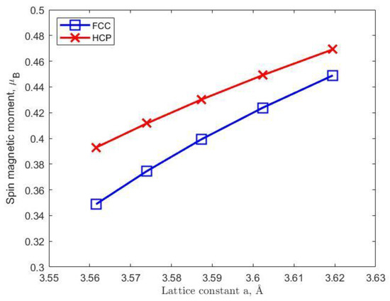 Paramagnetic spin moment on a nickel atom as a function of equilibrium face-centered-cubic (FCC) lattice parameter at the corresponding temperature (see Figure 4). Solid lines with blue triangles and red squares show the results for, respectively, FCC and hexagonal-close-packed (HCP) crystal structures.