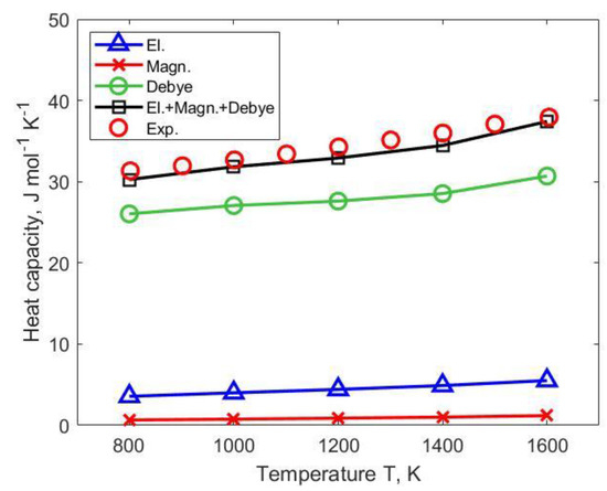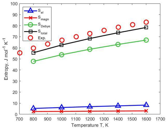 The largest contribution to both entropy and heat capacity comes from the lattice vibrations. Compared to the influence of phonons, the contributions due to electronic excitations and magnetic fluctuations are smaller. This means that a good model description of the vibrational free energy contribution is a key point in the modeling of temperature-dependent properties. In the present work, we have demonstrated that the EMTO–CPA method calculations, including the Fermi–Dirac distribution and self-consistent DLM formalism and combined with a quasi-harmonic Debye model, can reasonably well describe the contributions from electronic excitations, magnetic disorder, and lattice vibrations. This makes the EMTO-based approach a powerful and efficient tool for predicting the thermodynamic properties of materials.