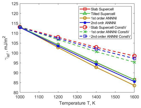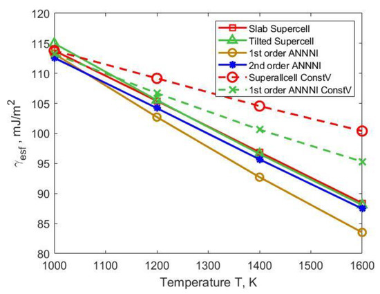 Solid lines in Figure 11 and Figure 12 show the free energies of formation for an intrinsic stacking fault (ISF) and an extrinsic stacking fault (ESF) that have been calculated as a function of temperature at the theoretical equilibrium volumes shown in Figure 4. The calculations were done using the different approaches described in Section 2.4. The difference between the results of tilted supercell and slab supercell approaches is found to be negligible, so their dependencies in Figure 11 and Figure 12 are practically on top of each other. In some previous studies, a vacuum layer was added to the slab supercell geometry to yield stress-free boundary conditions [42,44,55]. However, in the present work, the slab supercell model can reasonably well predict the stacking fault energies even without the vacuum layer. At 1000 K, the ISF energy is calculated to be 113 mJ/m3 which is close to the value 118 mJ/m3 in the work of Zhao et al. [18], where the paramagnetic state of nickel had been treated as a nonmagnetic state; the smallness of the magnetic contribution should be the reason for the small difference between the ISF energy value obtained in the present work and Zhao’s result.
