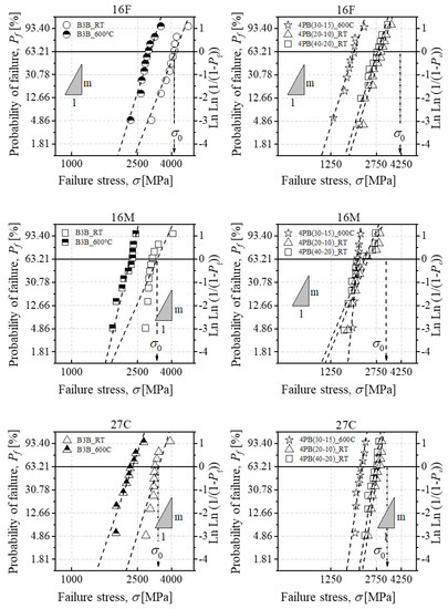 From the B3B tests, an approximately 30% reduction in strength was observed for the three grades. However, for 4PB tests, different levels of degradation were evidenced; the 16F grade (lowest λCo) exhibited the highest degradation, whereas the 16M grade, which exhibited the lowest mechanical strength at room temperature, had the lowest degradation. The different behaviour between both tests may be, again, a consequence of the defect size distribution in the samples and the different effective volumes tested. Note from Figure 2 that the Weibull diagrams of the 4PB tests for the different grades at room temperature tend to diverge at lower failure stress values (larger defects), whereas at higher stress values (smaller defects), the differences are significantly reduced and, in some cases, negligible. However, at 600 °C, the differences between the Weibull diagrams of the three grades are significantly reduced in a wider range of the failure stress, suggesting that, due to oxidation, the size distribution of defects became more homogeneous and similar for all the samples.