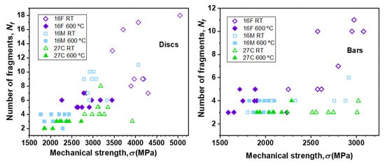 Figure 3 shows the relationship between the number of fragments generated due to the fracture process (Nf) and the mechanical strength (σ) for the three WC-Co grades evaluated at both temperatures and test configurations, from which a direct correlation between both parameters can be extracted. In general, a higher number of fragments was obtained when the mechanical strength of the specimens increased. This direct correlation between Nf and σ is the result of the excess strain energy stored in the material during bending, which is released at fracture. In specimens with the highest mechanical strengths, the broken pieces generated were so numerous that some of them were impossible to collect, which caused Nf scattered values. For the three grades and the B3B configuration, the number of fragments of the tested samples was always smaller at 600 °C due to the presence of larger and more homogeneous defects. This behaviour was not observed so clearly in the samples tested under the 4PB configuration, except for the 16F grade, which exhibited, as mentioned above, the largest mechanical degradation at 600 °C. Moreover, Nf also correlates with KIc. In this sense, if the 16M and 27C grades with similar strength are compared, the differences found in Nf are associated in this case with the different KIc values between both grades.