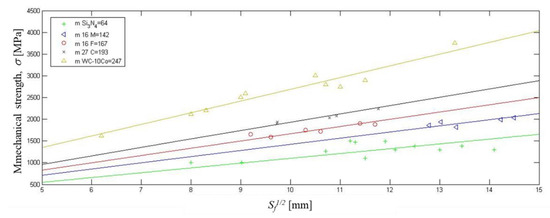 In Figure 4, σ is plotted versus Sf1/2 for some representative bar specimens of the three cemented carbide grades. The results obtained for Si3N4-based ceramics and 10 wt.% WC-Co are also included in Figure 4 [21,22]. A linear correlation was observed, which is in agreement with Equation (5). According to this same equation, the ratio between the slopes of the linear fit corresponding to two different materials should allow the estimation of the ratio between their fracture toughness values (if ø is equal for both materials). In this sense, from the slopes of the 16M and 27C grades in Figure 4, a ratio of 0.9 was obtained, which was close to the value of 0.71 obtained for the ratio of KIc values for these two grades measured by the single edge notched bend (SENB) method [14].