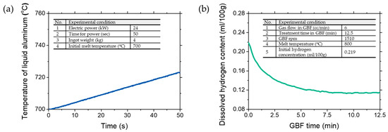 In earlier works, various models have been proposed to predict the temperature of the liquid aluminum based on the empirical [15,16] and numerical [17,18,19] approaches. Wang et al. examined the computational fluid dynamics(CFD)-Taguchi combined method for the design of process parameters to optimize the aluminum melting [16]. To understand the melting behavior of the liquid aluminum by each process parameter, Quintana et al. [17], Nieckele et al. [18], and Bulin’ ski et al. [19] proposed the numerical solutions considering the heat transfer and the flow behavior based on the process parameters. Numerous studies on the quantification of the dissolved hydrogen content in the liquid aluminum have also attracted much attention from researchers for a long time [11,20,21,22,23,24,25,26]. Various melt treatments to control the dissolved hydrogen content in the liquid aluminum such as gas bubbling filtration (GBF) [20,21], degassing agent [22,26], and ultrasonication [24,25,27] have been introduced. Among these techniques, the GBF is one of the most effective processes, which has an obvious effect on degassing of hydrogen in the liquid aluminum with minimizing the melt loss and the dross formation. Previous studies have reported on the effect of process parameters such as the GBF processing time, GBF rpm, and the type of impeller on the dissolved hydrogen content in the liquid aluminum [20,21,28,29].