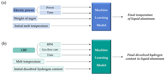 Recently, the machine learning (ML) models have been used as an alternative way to overcome the limitations in the empirical and numerical models to successfully predict the material properties [30,31,32]. It has become increasingly popular with advantages of being able to quickly solve the problems compared to other models based on the empirical and numerical approaches, and has the strong ability to deal with discrete data. In some researches, the ML models have already been adapted for predicting the melt temperature [33,34] and the porosity [35,36] in various materials including the aluminum alloys. However, the ML model of the temperature of the liquid aluminum and the dissolved hydrogen content in the liquid aluminum based on the experimental data, with consideration of the combination of process parameters, has not been sufficiently proposed.