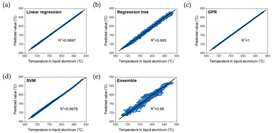 Figure 3 shows the scatter plots of the predicted values versus the experimental data of the temperature for the liquid aluminum with the machine learning models with the highest accuracy in each model type. The performance of the models seems to be similar as the coefficients of determination were close to 1 for all models; this means that the given data set of the temperature of the liquid aluminum was linear in nature.