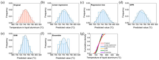 Data distribution of temperature of liquid aluminum from (a) new experiment for prediction and predicted value by different machine learning (ML) models of (b) linear regression, (c) regression tree, (d) GPR, (e) SVM and (f) ensemble regression trees. The colored area in each graph of (a–f) (red, or blue) describes corresponding probability density function for the data distribution. (g) The corresponding cumulative density function for predicted values from each ML model compared to the histogram of the experimental value of temperature of liquid aluminum.