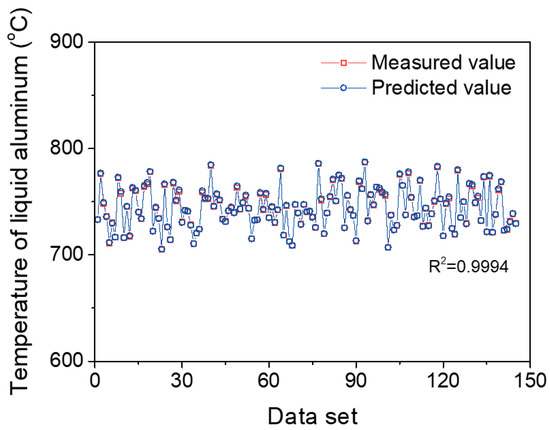 Figure 4 shows the probability distribution function (PDF) and cumulative distribution function (CDF) plots of new experiments and the prediction of the temperature of the liquid aluminum by the developed models. The PDF curves were fitted using the normal distribution option. The new experimental data in Figure 4 were obtained with 6 kg of aluminum ingot and 27 kW of electric power conditions under various times for electric power with 145 sets of data, which were not used for the development of machine learning model. The estimated parameters of the experimental data set from the normal distribution are listed in Table 6. In Figure 5, the comparison of measured values by experiments versus predicted values by linear regression model is shown with good agreement between the measurement and the predicted values with R2 of 0.9994.