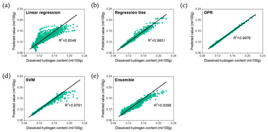 Scatter plots of predicted values versus experimental values of dissolved hydrogen content in liquid aluminum for different ML models of (a) linear regression, (b) regression tree, (c) GPR, (d) SVM, and (e) ensemble regression trees.