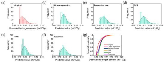 Data distribution of dissolved hydrogen content in liquid aluminum temperature from (a) experimental results and predicted value by different ML models of (b) linear regression, (c) regression tree, (d) GPR, (e) SVM, and (f) ensemble regression trees. The colored area in each graph of (a–f) (red, or green) describes corresponding probability density function for the data distribution. (g) The corresponding cumulative density function for predicted values from each ML model compared to the histogram of the experimental values of the dissolved hydrogen content in liquid aluminum.