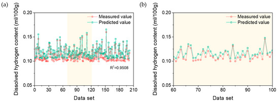 (a) The comparison of measured values by experiment versus predicted values by GPR model for dissolved hydrogen content in the liquid aluminum, and (b) the magnified graph in the selected range.