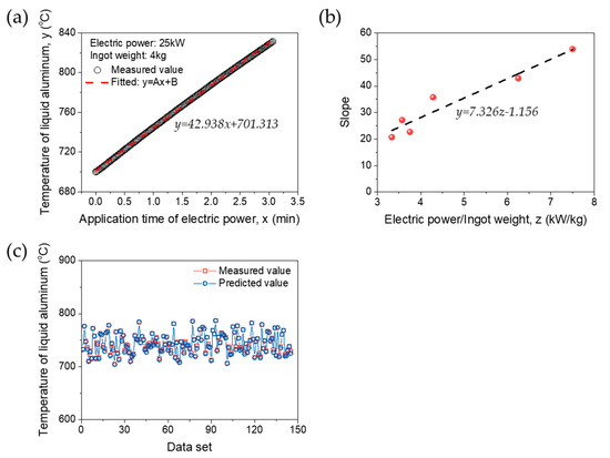 The temperature of the liquid aluminum had a linear relationship with the application time of electric power as shown in Figure 1a. The linear function was a form of , where is the slope and is the intercept of . The slope () and intercept () of linear relationship between the temperature of the liquid aluminum () and the application time of the electric power () depend on the experimental conditions. The slope and intercept are identified under all the experimental conditions, and one example is shown in Figure 9a under the electric power of 25 kW with the ingot weight of 4 kg. In particular, the most influential factors affecting the slope of this linear relationship were found to be the electric power and the ingot weight. Generally, the larger the weight of ingot, the higher level of electric power was required for melting of ingot. Therefore, the values of slope were plotted as a function of electric power/ingot weight (z, kW/kg) as shown in Figure 9b, and it was also fitted with the linear function: . The intercept values () of linear relationship between the temperature of the liquid aluminum and the application time of electric power show fairly similar values of 697.014 to 701.921, therefore is assumed to be 700.141 from the average of the obtained intercept values. Finally, the numerical model to predict the temperature of liquid aluminum is suggested as: , where is the electric power/ingot weight. Using the test data set described in Figure 5, the temperature of the liquid aluminum was predicted based on the suggested numerical model, as shown in Figure 9. By comparing with the results predicted by the linear regression model from the ML approach, the numerical model showed a comparable performance of R2 of 0.9961 with a simple assumption and approach, but the performance of numerical model was still lower than that of ML model.