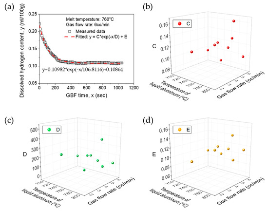 (a) Numerical fitting of measured value (one example of experimental results: temperature of liquid aluminum 760 °C, gas flow rate 6 cc/min). Fitted parameters of (b) C, (c) D, and (d) E depending on temperature of liquid aluminum and gas flow rate.