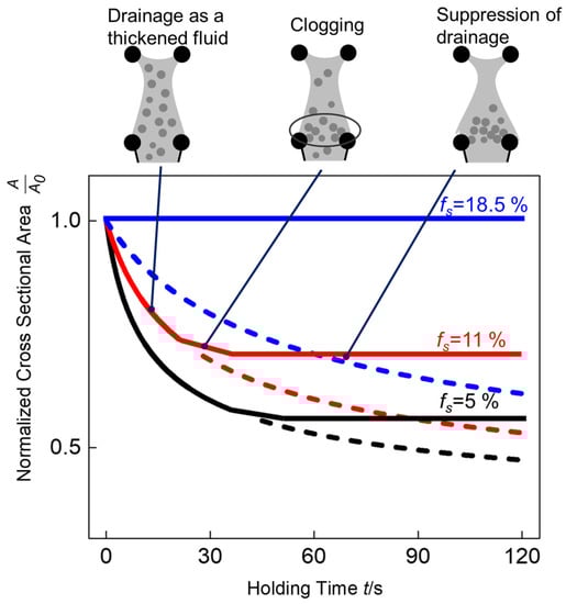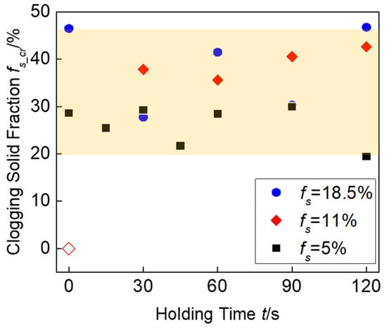 - The clogging occurs earlier as the solid fraction increases. For solid fraction fs = 18.5% clogging seems to be already occurring in holding time t = 0 s.