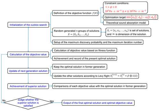 Flow chart of identification of the acoustic characteristic parameters through the cuckoo search algorithm.