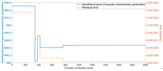 In Equations (6) and (7), it was interesting to note that the static flow resistivity and porosity always appeared in the form of a product, which indicated that optimal solutions of the acoustic characteristic parameters were a group instead of only one. Thus, the product of the static flow resistivity and porosity was treated as one parameter, and the optimization result of the cuckoo search identification algorithm is shown in Figure 4. Along with the increase of the function evaluation times from 0 to 2000, it could be observed that the identified product of the acoustic characteristic parameter and the residual error gradually stabilized. The optimal product of static flow resistivity and porosity obtained by the cuckoo search algorithm was 6982.5, and the optional acoustic characteristic parameters are shown in Figure 5. With ranges of the porosity from 0.1 to 1, the corresponding static flow resistivity decreased from 69,825 to 6982.5 . Though the accurate static flow resistivity and porosity were not confirmed by the cuckoo search identification algorithm, the obtained optimal product of the two structural parameters was enough for the further improvement of the sound absorption performance of the porous metal. Moreover, non-uniqueness of the optional acoustic characteristic parameters indicated that different porous metal could exhibit the same sound absorption performance as long as the product of the static flow resistivity and the porosity were equal. Therefore, the excellent sound absorbers with unique properties, such as high fire retardancy, strong corrosion resistance, outstanding light transparency, and so on, could be developed through choosing different kinds of porous material. Furthermore, as mentioned above, the test of porosity of the porous metal was easy to realize relative to that of its static flow resistivity. Therefore, the porosity of the porous metal utilized in this study was measured through the drainage method [40], and its actual value was 0.9136. The static flow resistivity could be calculated, 7642.8 . The labeled porosity and static flow resistivity provided by the supplier were 0.9 and 7680 , respectively, which could validate the effectiveness and accuracy of the cuckoo search identification algorithm.