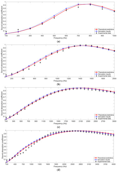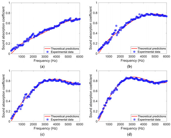 Comparisons of the theoretical predictions and the experimental data of sound absorption coefficients of the porous metal (a) with a thickness of 15 mm, (b) with a thickness of 20 mm, (c) with a thickness of 25 mm, and (d) with a thickness of 30 mm.