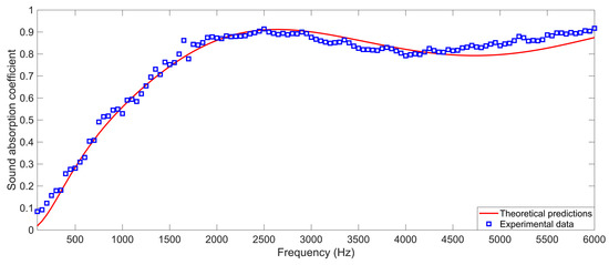 Besides the above experimental verifications, sound absorption coefficients of the porous metal with a thickness of 35 mm were theoretical analyzed and experimental measured, and the results are shown in Figure 7, which exhibited their consistency. The calculated value between the theoretical predictions and the experimental data was 0.9982, which indicated that the identification of acoustic characteristic parameters of the porous metal through the cuckoo search algorithm had universality other than for the limited thickness. Moreover, the obtained accurate identified acoustic characteristic parameters would be favorable to improve sound absorption coefficients of the porous metal and promote its practical application.