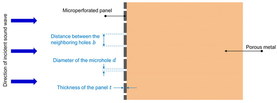 The sound absorption coefficient of the porous metal could be improved by a adding microperforated metal panel in front of it to form a composite sound-absorbing structure [13], as shown in Figure 8. Besides the acoustic parameters of the porous metal, structural parameters of the microperforated panel, which included thickness of the panel , diameter of the microhole , and distance between the neighboring holes , together determined the corresponding sound absorption performance of the composite sound-absorbing structure.