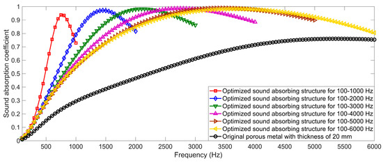 Comparisons of theoretical sound absorption coefficients of the optimized composite sound-absorbing structures and those of the original porous metal with a thickness of 20 mm are shown in Figure 9. Corresponding optimal average sound absorption coefficients of the composite sound-absorbing structure were 0.5393, 0.6533, 0.7159, 0.7562, 0.7830, and 0.7949 when the target frequency ranges were 100–1000 Hz, 100–2000 Hz, 100–3000 Hz, 100–4000 Hz, 100–5000 Hz, and 100–6000 Hz, respectively. In contrast, it could be calculated that the average sound absorption coefficients of the porous metal with a thickness of 20 mm were 0.1575, 0.2791, 0.3804, 0.4644, 0.5250, and 0.5626, respectively, for the variable target frequency ranges, which indicated that they were increased by 240%, 131%, 85%, 61%, 48%, and 41%, respectively, by adding the prepositive microperforated metal panel. It could be easily found that the improvements were remarkable, especially when the target frequency range was in the low-frequency band. The major reason for this phenomenon was that the porous metal had the superiority in the absorption of the mid-high-frequency sound and the microperforated panel would be more effective in absorbing the sound in the low-mid-frequency band [22,23,24,42,43,44]. Thus, it could be concluded that the sound absorption performance of the porous metal would be improved significantly by adding the thin prepositive microperforated metal panel and optimizing parameters of the composite sound-absorbing structure, which was propitious to promote the application of the porous metal in sound absorption.