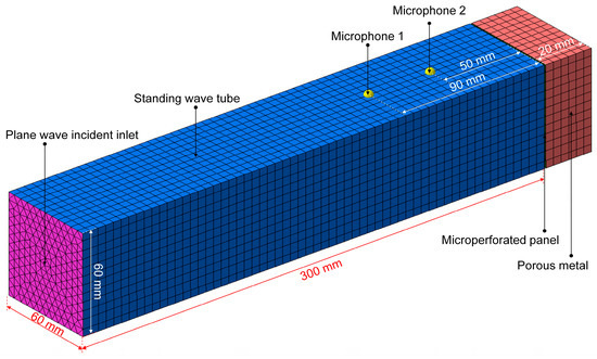 The finite element simulation model of the composite sound-absorbing structure was constructed in the virtual acoustic laboratory [13,33,34,35], as shown in Figure 10, which could simulate the sound absorption coefficient of the sound absorber according to the standing wave tube method. The size of the rectangular standing wave tube was 60 mm × 60 mm × 300 mm, and the plane wave was introduced at its front surface as an incident wave of the acoustic source. Meanwhile, the tested sound absorber was fixed at the back surface of the tube, and two microphones were installed on the tube. For the porous metal in the composite sound-absorbing structure, its sound absorption effect was confirmed by setting its thickness and inputting the identified acoustic characteristic parameters. Moreover, with regard to the prepositive microperforated panel, its sound absorption effect was represented by the transfer admittance relation loaded between the back surface of the standing wave tube and the front surface of the porous metal, as shown in Figure 10, which could be calculated according to optimal structural parameters in Table 1. The sound absorption coefficients of the composite sound-absorbing structures would be calculated by the obtained sound pressures from the two microphones. By setting the simulated frequency ranges, the sound absorption performance of the composite sound-absorbing structure for the variable target frequency range was simulated, which supplied preliminary verification for the identification and optimization.