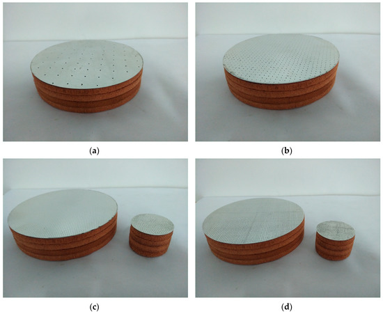 It could be judged from the optimal parameters in the Table 1 that with increase of frequency ranges 100–1000 Hz and 100–6000 Hz, diameter of the microhole and distance between the neighboring holes gradually decreased, which indicated that the manufacturing cost would rise notably, because there would be more microholes with smaller size to perforate. Taking the optimal composite sound-absorbing structure for the target frequency range of 100–6000 Hz as an example, the optimal diameter of the hole was 0.05 mm and optimal distance between the neighboring holes was 0.07 mm, which indicated that there would be more than 204 (1/0.07 × 1/0.07) microholes to perforate only for the 1 mm × 1 mm square area. The excessive manufacturing cost implied that this improvement was meaningless, except for some extremely special circumstances. There was a similar situation for the optimal composite sound-absorbing structure with the target frequency range of 100–5000 Hz. Therefore, these two prepositive microperforated panels were not prepared in this study. The other four prepositive microperforated metal panels were prepared through the laser beam machining [45], and the assembled composite sound-absorbing structures are shown in Figure 11. Afterward, sound absorption coefficients of the composite sound-absorbing structures were tested by the AWA6128A detector by replacing the detected porous metal by the composite sound-absorbing structures in Figure 2. According to the operating instruction of the AWA6128A detector, sound absorption coefficients in the frequency range 100–2000 Hz were obtained through measuring the bigger sample with a diameter of 96 mm, and those in the 2000–6000 Hz range were achieved by testing the smaller sample with a diameter of 30 mm. In this way, actual sound absorption coefficients of the optimal composite sound-absorbing structures for the 100–1000 Hz, 100–2000 Hz, 100–3000 Hz, and 100–4000 Hz were obtained, which could be compared with theoretical predictions and simulation results. Similar to standing wave tube measurement of the porous metal, each optimal composite sound-absorbing structure was measured 10 times, and the final experimental data was the average value of the 10 testing data, which aimed to reduce the measuring error in the testing program.
