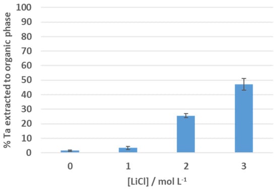 Extraction of tantalum from aqueous solutions of TaCl5 in 12 M HCl with varying concentrations of LiCl into a toluene solution of L. Conditions: TaCl5 (0.01 M) in 12 M HCl with 0–3 M LiCl (2 mL) stirred with L (0.1 M) in toluene (2 mL); phases contacted for 1 h at RT with magnetic stirring. Experiments performed in duplicate and reported as an average.