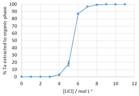 To our knowledge, there are very few reports that describe the extraction of tantalum from chloride-based media; acids such as HCl were tested in the extraction of TaF5, but in these cases, significant solubility issues were seen [20]. Despite the limited speciation data available for tantalum in halide acids, previous theoretical studies have postulated that TaCl5 could behave in a similar manner to TaF5 in aqueous solution, so forming halidometalates such as TaCl6− in the presence of excess chloride ion [21,22].