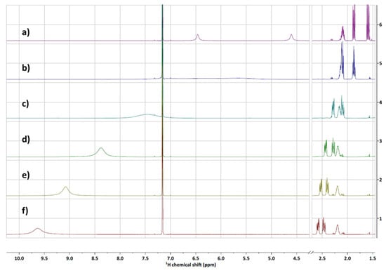 1H NMR spectra of (a) 0.1 M L in C6D6; then 0.1 M L in C6D6 after contact with 0.01 M TaCl5 in 1 M HCl and: (b) 5 M LiCl; (c) 6 M LiCl; (d) 7 M LiCl; (e) 8 M LiCl; (f) 9 M LiCl.