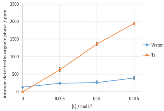 Karl-Fischer titrations were undertaken to determine the role of water in the extracted species. It is seen that as more tantalum transfers to the organic phase, the concentration of water does not significantly increase, ruling out a micellar extraction mechanism (Figure 6). However, at even higher concentrations of L where the concentration of tantalum in the organic phase does not change, more water is transported, suggesting that water transport into the organic phase is associated with the concentration of L.